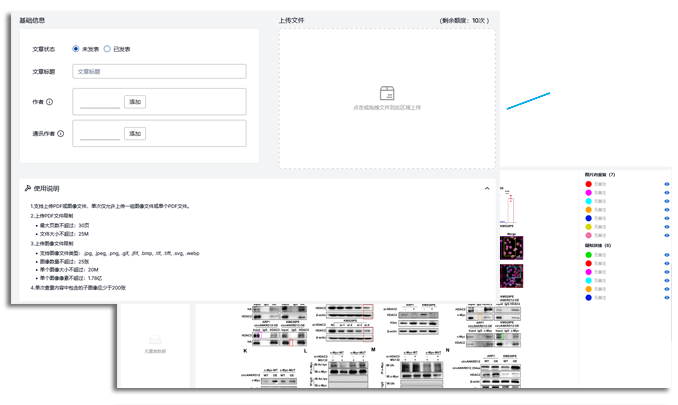 图片查重系统是一套功能全面、操作便捷且高度自动化的解决方案,专为满足生物医学领域的科研诚信审查需求而设计。系统具备精准高效的查重核心能力,能有效检测包括整图复制、区域裁剪、旋转、拉伸、色彩调整在内的多种图像重复使用行为,并对重复区域进行定位标识与相似度计算。它实现了对单篇论文或全网公开SCI文献的双重覆盖,确保了对跨文章重复问题的深度挖掘。系统支持多种生物医学实验图片类型,如Western Blot、免疫组化、流式细胞等,并提供一键上传PDF或图片即自动查重的便捷操作。在性能上,系统保障了高检中率与准确率,同时将平均查重时间控制在3分钟以内。查重结果展示清晰直观,可高亮重复区域、放大细节,并自动关联原文出处(如DOI)。系统支持院内部署,提供完整的用户管理、在线支付、额度分配以及自动生成、可人工复核与标注的详细查重报告功能,旨在为医院及科研机构提供从发现问题到审核管理的全流程图片学术不端行为筛查与管理服务。