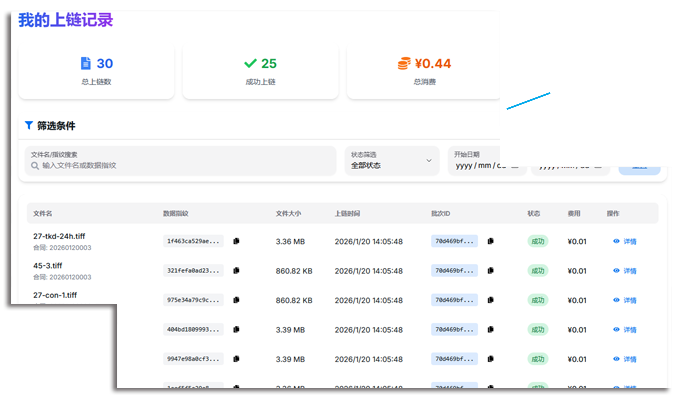系统提供一套集第三方供应商管理与数据可信存证于一体的区块链解决方案,旨在构建医院对外部数据质量与来源可信度的治理体系。系统核心功能包括:严格的供应商注册与审批流程,确保数据源头的合法合规;关键的数据上链存证能力,能够为每条外部数据生成唯一的区块链哈希指纹,并支持批量操作,以固化数据交付前的原始状态;自动化的证据链生成,将数据与供应商身份、时间戳不可篡改地关联,形成完整的溯源凭证。此外,系统提供数据指纹查重预警、可下载的数据清单管理,并部署包含完整功能的区块链节点,为医院建立了一个透明、可审计、防篡改的第三方数据接入与治理平台。